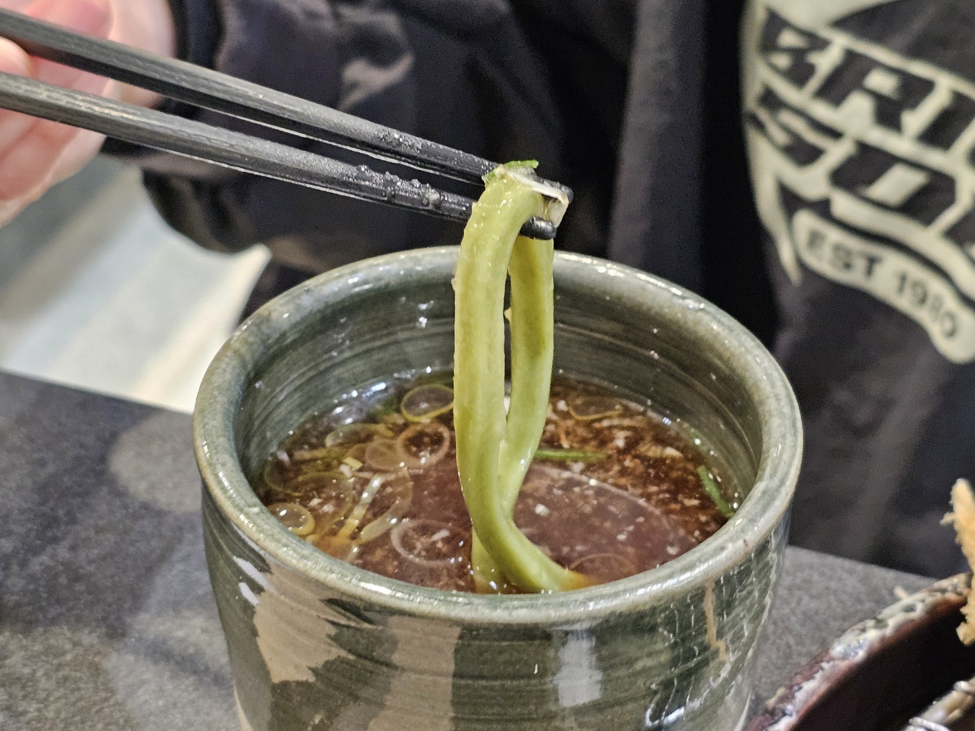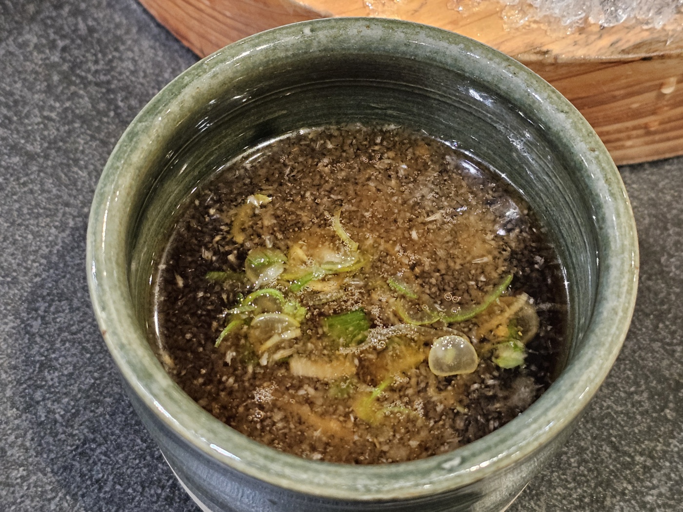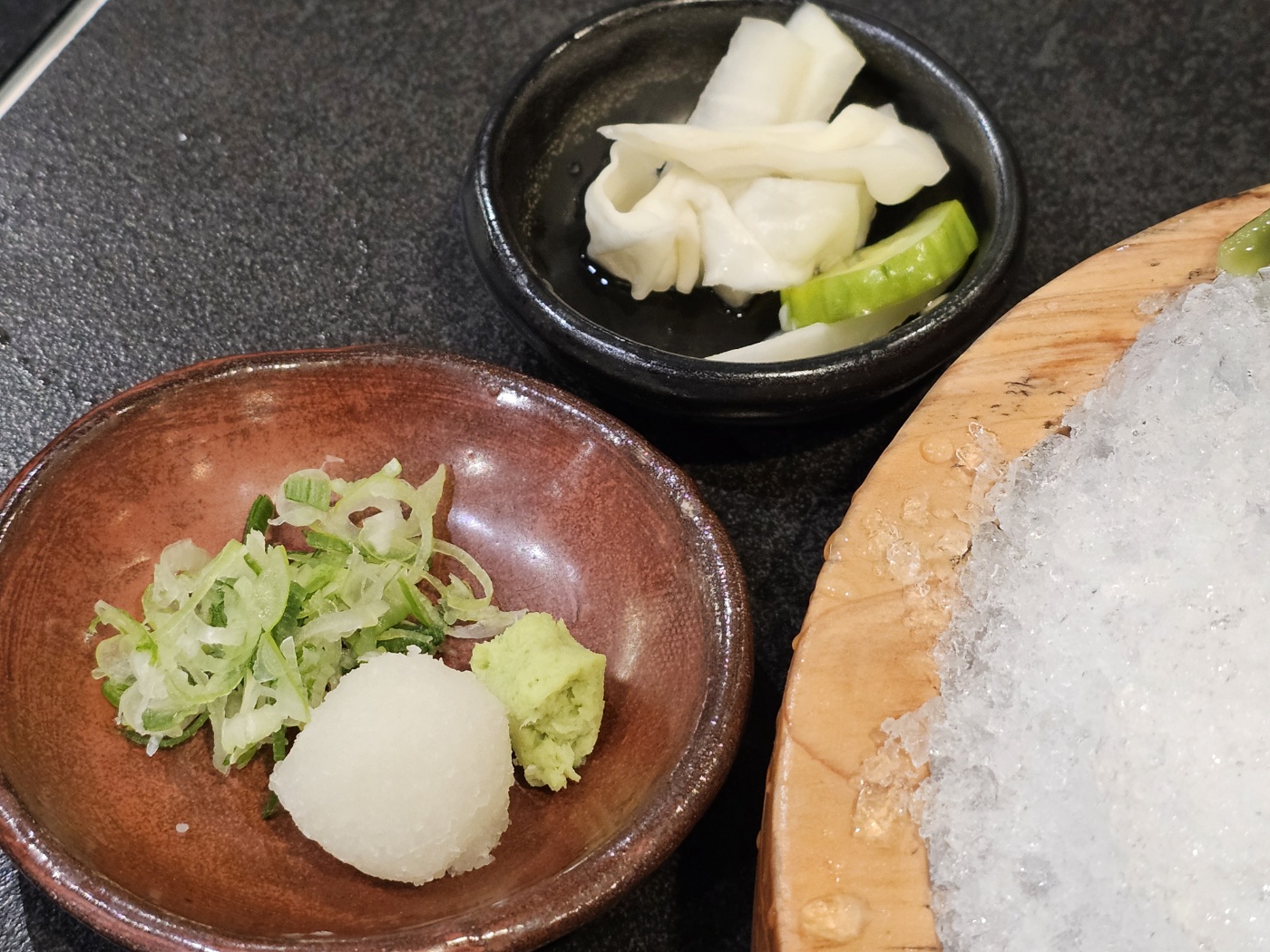 쯔유에 파, 무, 와사비를 적당히 넣고 자루 우동면을 2-3가닥씩 찍어라고 되어 있습니다.