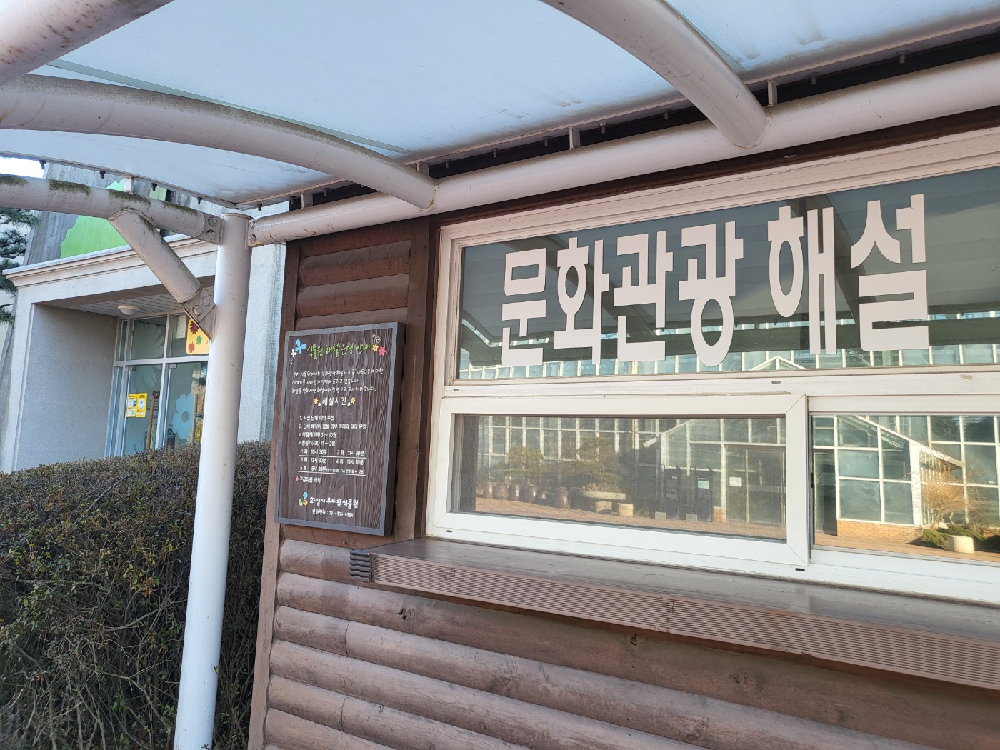 유리 온실 앞에는 식물원 해설 안내가 적혀있어요.