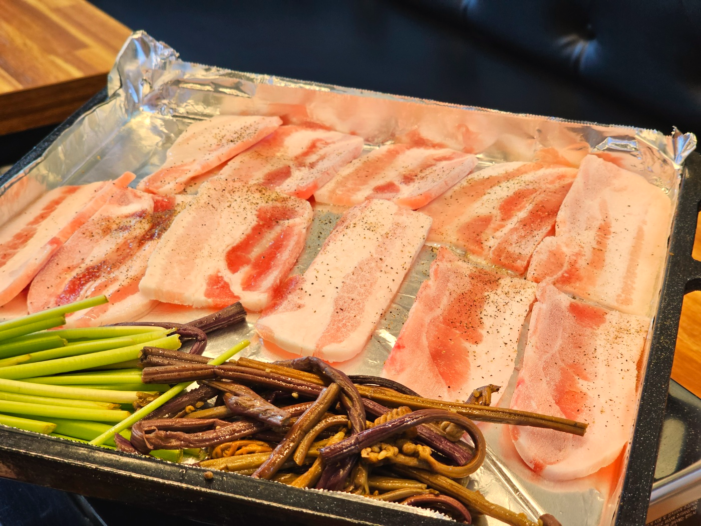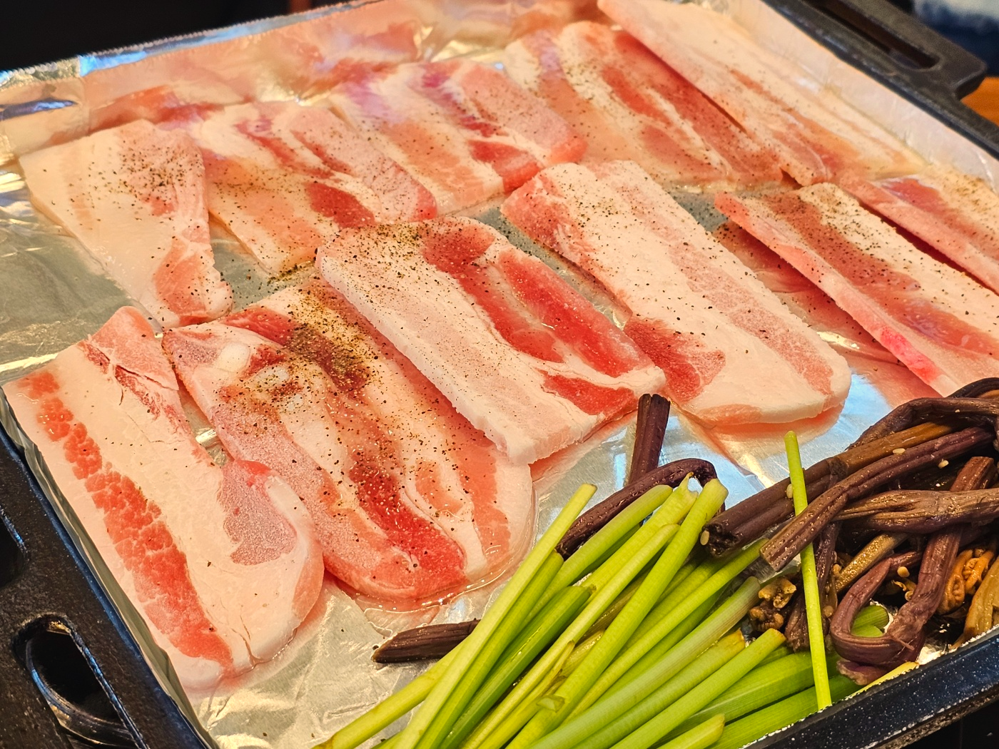 얼른 불판에 나란히 올려서 후추를 솔솔 뿌려뿌려~~