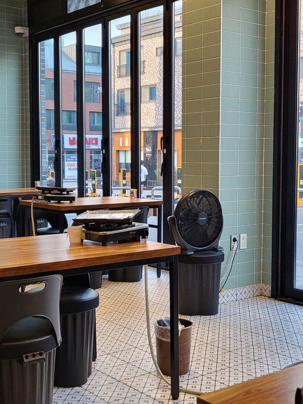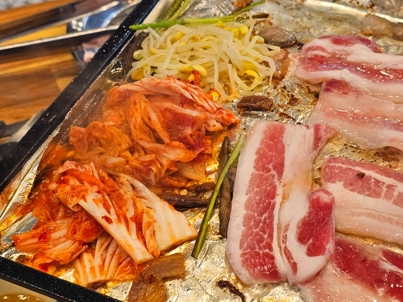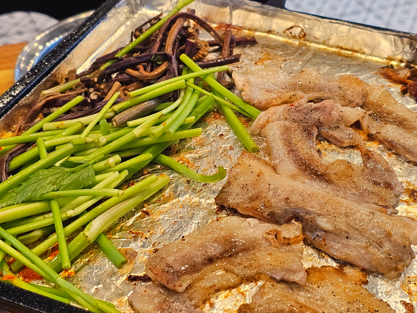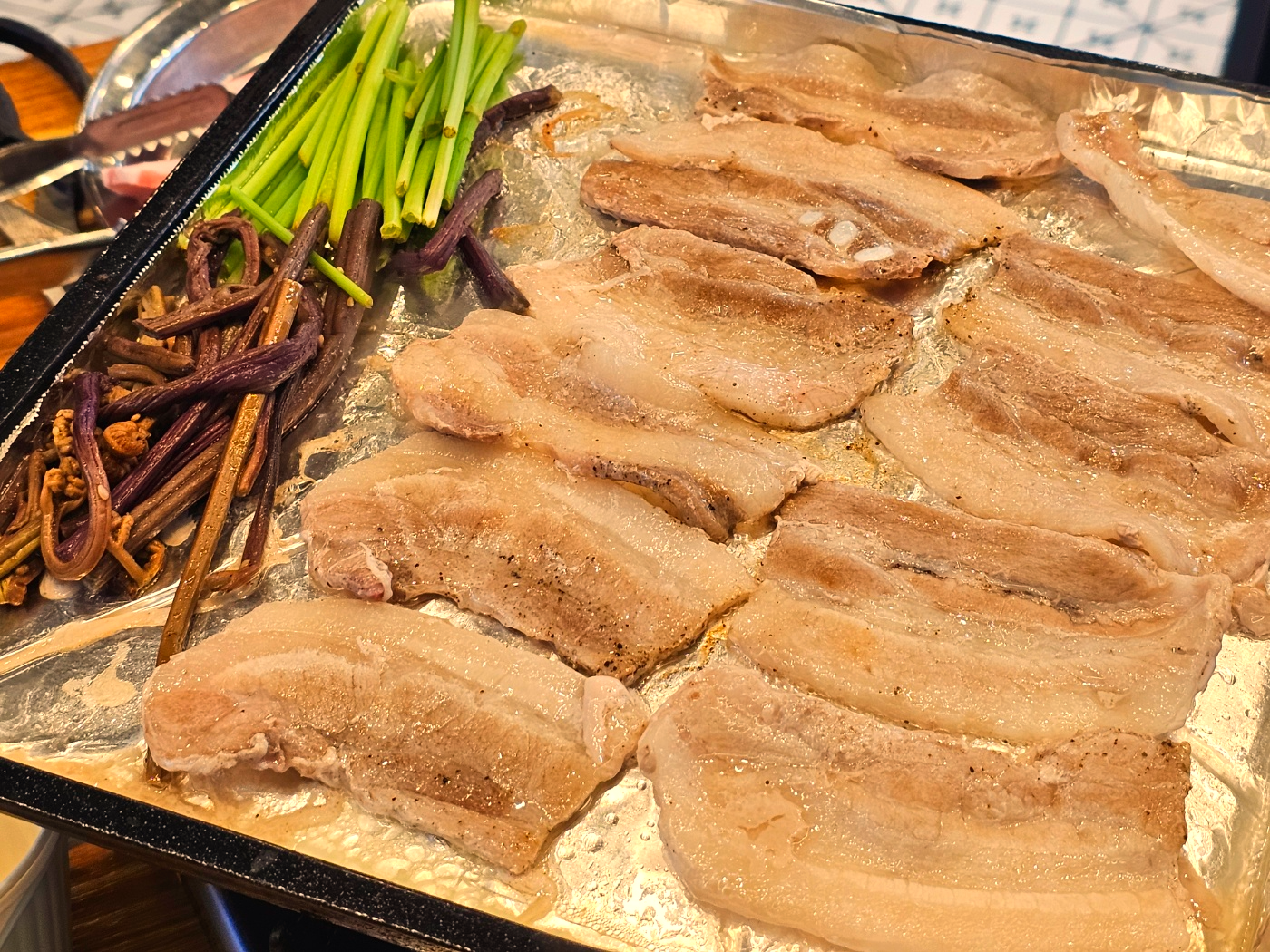 테이블마다 하나씩 있는 그릴에 냉삼집 특유의 은박지가 씌어져있어요.