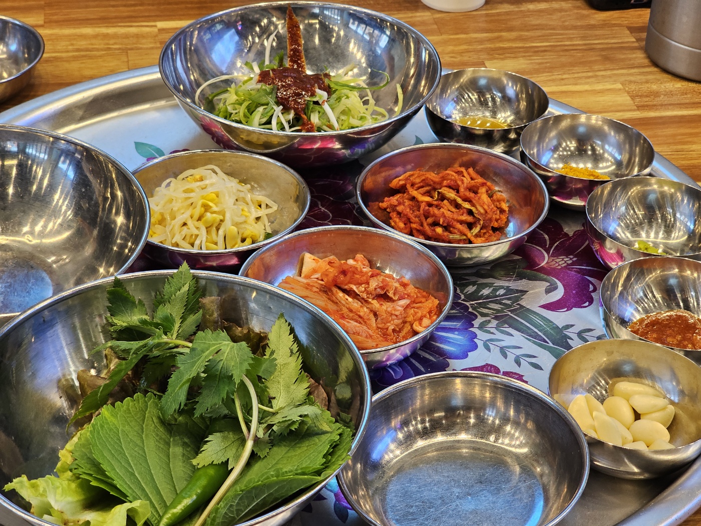 고기 주문 뒤 바로 나오는 기본 상차림입니다.
