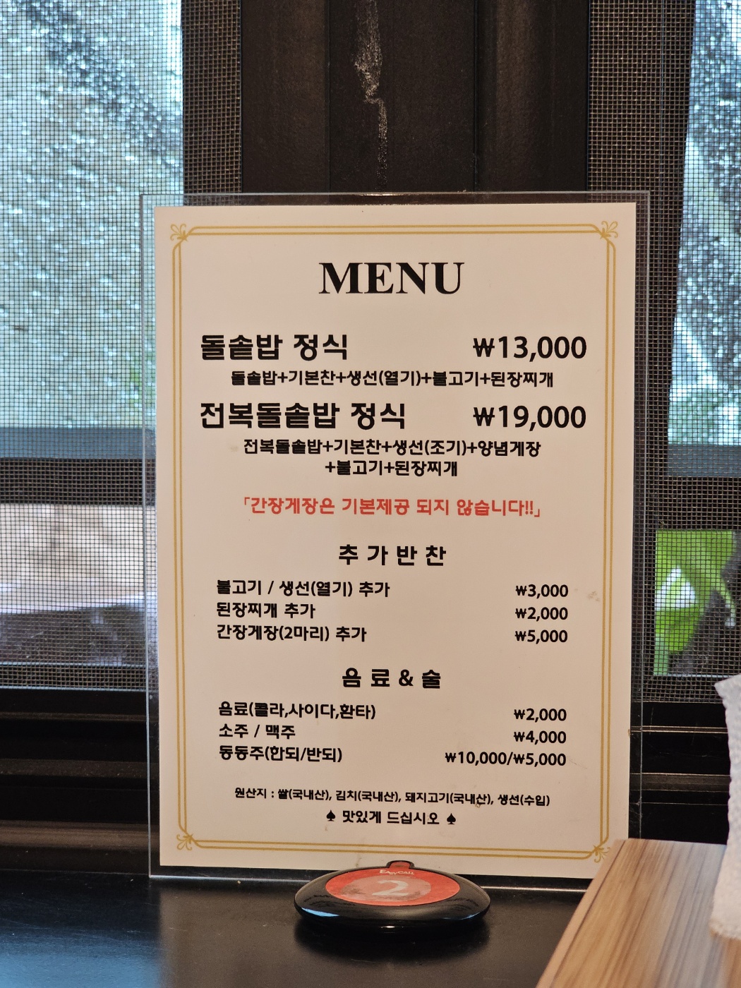 메뉴는 돌솔밥 정식과 전복돌솥밥이 전부이고 추가 반찬과 음료와 술이 있습니다.
