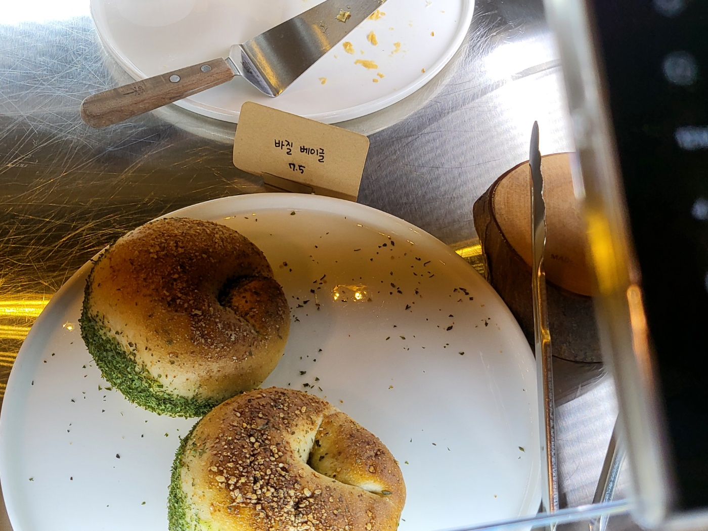 베이커리 테이블 시작점에 사용 전 집게가 담긴 바구니가 있었어요.