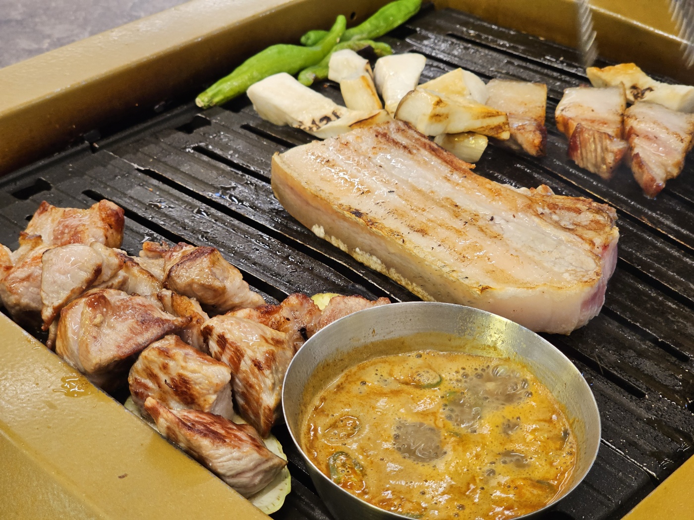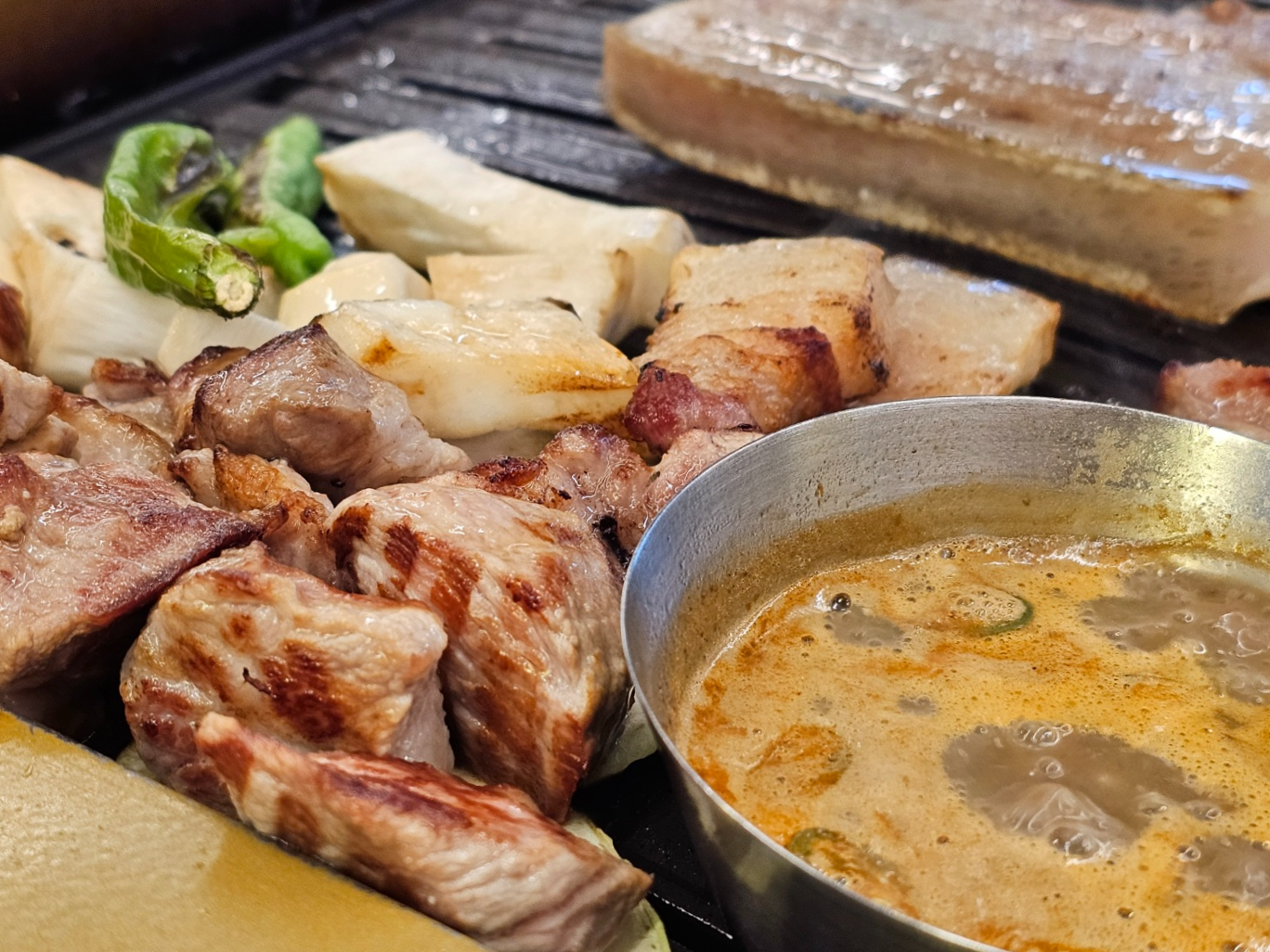 노릇하게 구운 흑돼지를 멜젓에 찍어 먹으니까 너무 맛있었어요.