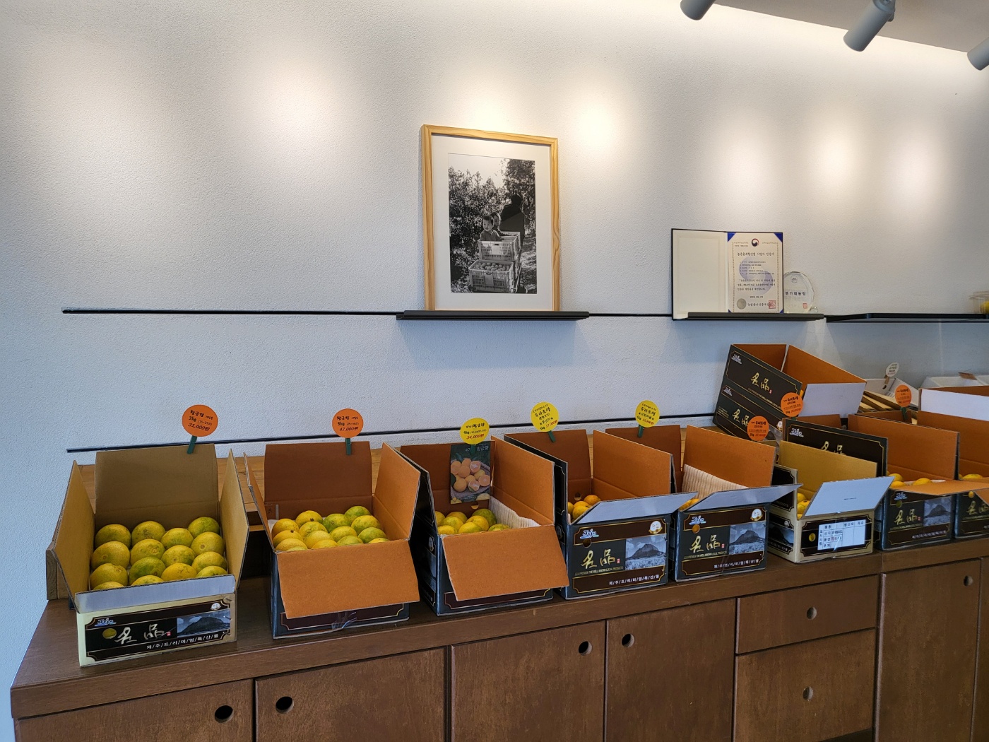 여러 종류의 귤들이 샘플로 진열되어 있어서 사장님께서 친절하게 설명을 해주십니다.