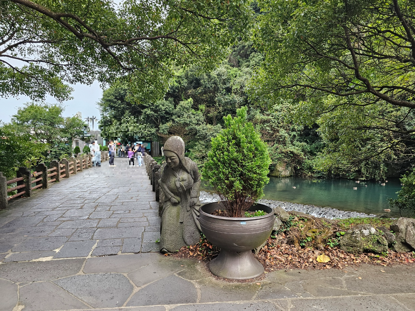 천지연 폭포 앞에 엄청나게 많은 관광객들이 있었어요.