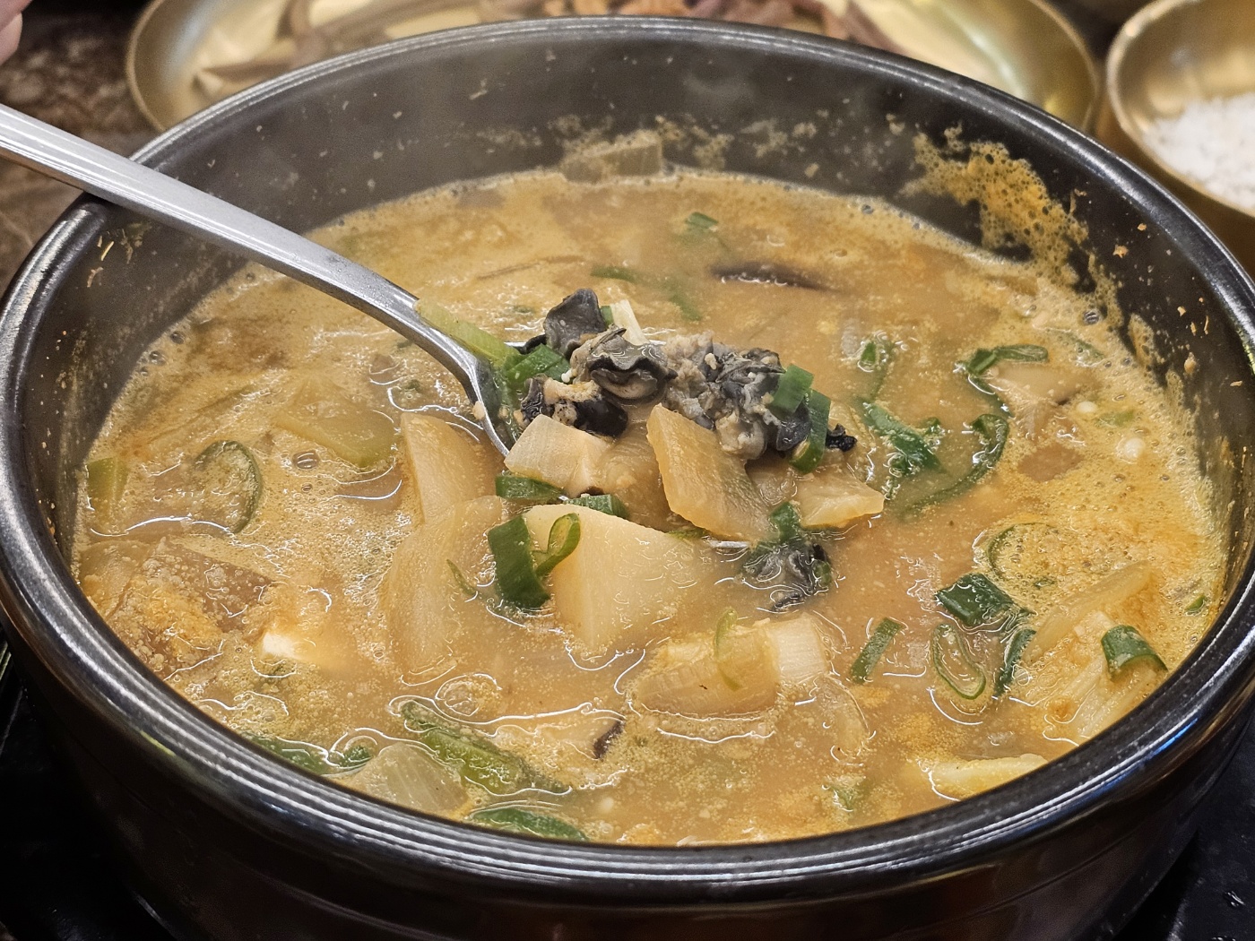 그리고 네이버 리뷰 이벤트로 받은 우렁된장찌개에 공기밥 하나 말아서 된장말이밥으로 먹었습니다.
