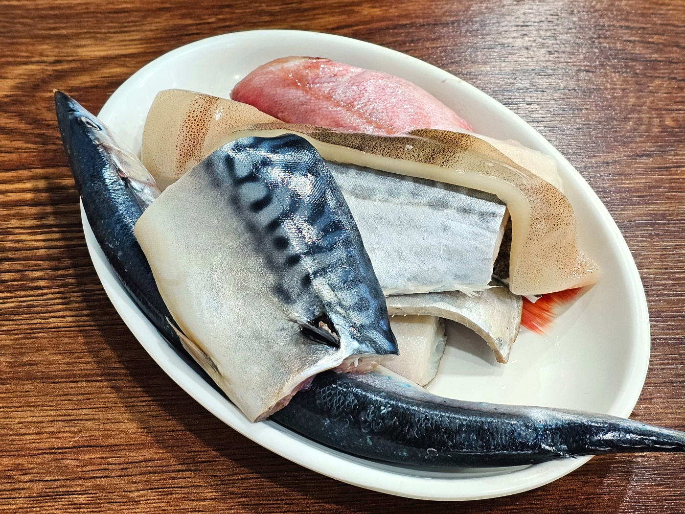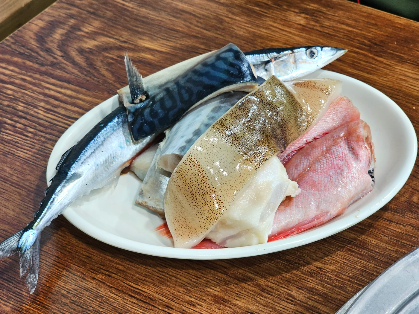 모듬구이 생선은 꽁치, 고등어, 삼치, 메로, 황열갱이, 오징어, 청어, 가자미로 구성되어 있습니다.