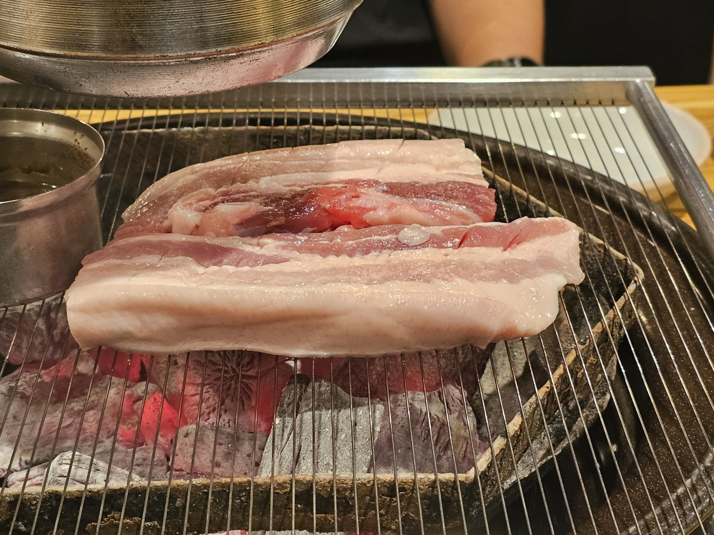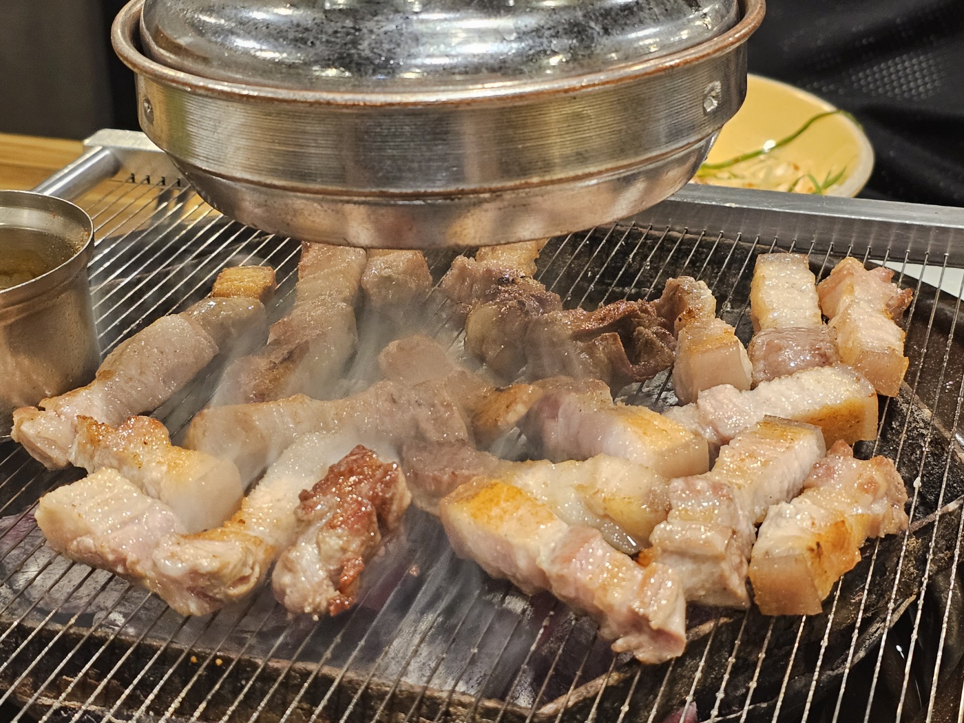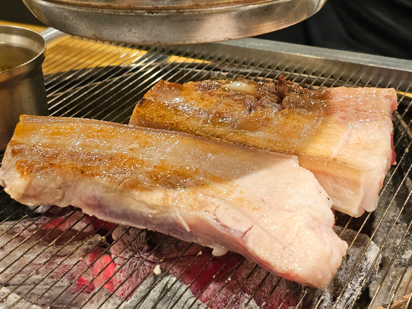 노릇노릇하게 구워지고 있는 오겹살이 보이시나요?